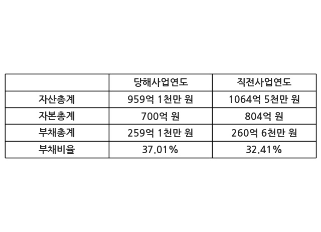 또한, 이번사업연도의 자산총계는 959억 1천만 원으로 직전사업연도 대비 -9.91% 감소한 한편, 부채총계는 259억 1천만 원으로 -0.57% 감소, 자본총계는 700억 원으로 -12.93% 감소했다.