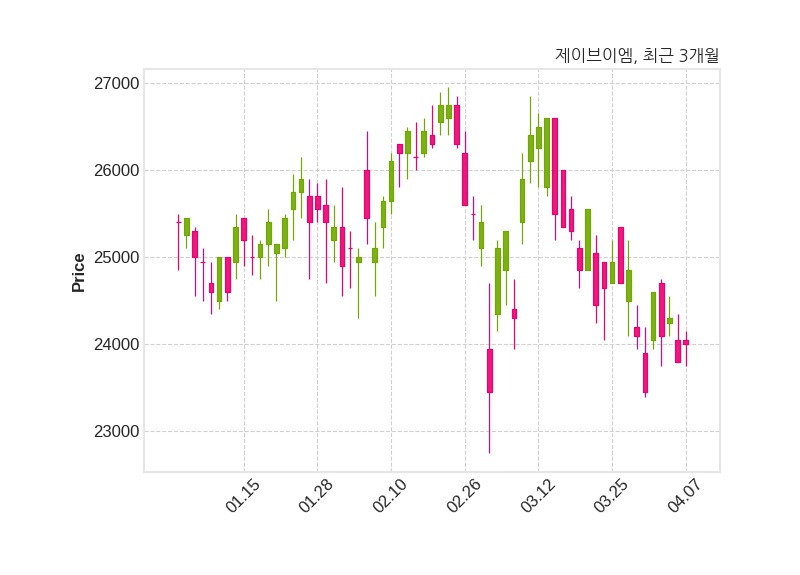 한편, 제이브이엠의 15시 21분 현재주가는 24,000원으로 직전 거래일 대비 200원(+0.84%) 상승이며, 거래량은 7,088주이다.