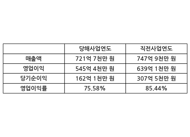 이번사업연도의 매출액은 직전사업연도 대비 -3.51% 감소한 721억 7천만 원, 영업이익은 545억 4천만 원, 당기순이익은 162억 1천만 원이라고 공시했다.