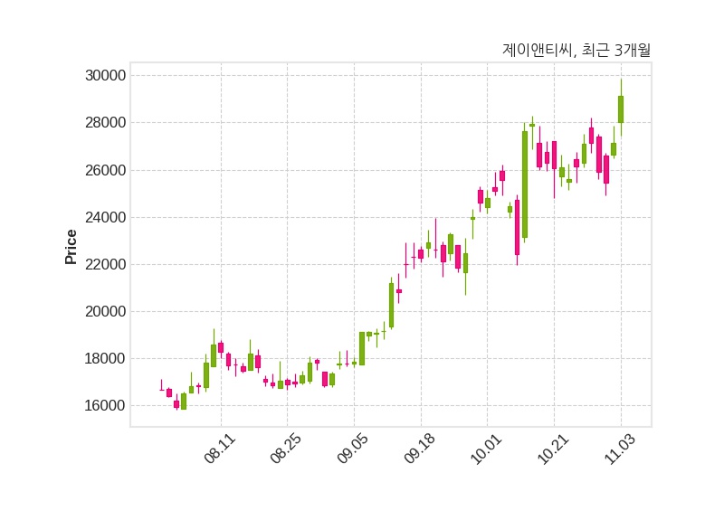 한편, 제이앤티씨는 장 마감 이후 해당 기업공시를 발표했으며 오늘 종가가 29,150원, 거래량은 1,247,688주로, 직전 거래일 대비 2,000원(+7.37%) 상승했다.