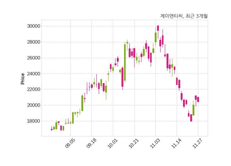 한편, 제이앤티씨의 15시 01분 현재주가는 20,450원으로 직전 거래일 대비 300원(-1.45%) 하락이며, 거래량은 135,538주이다.