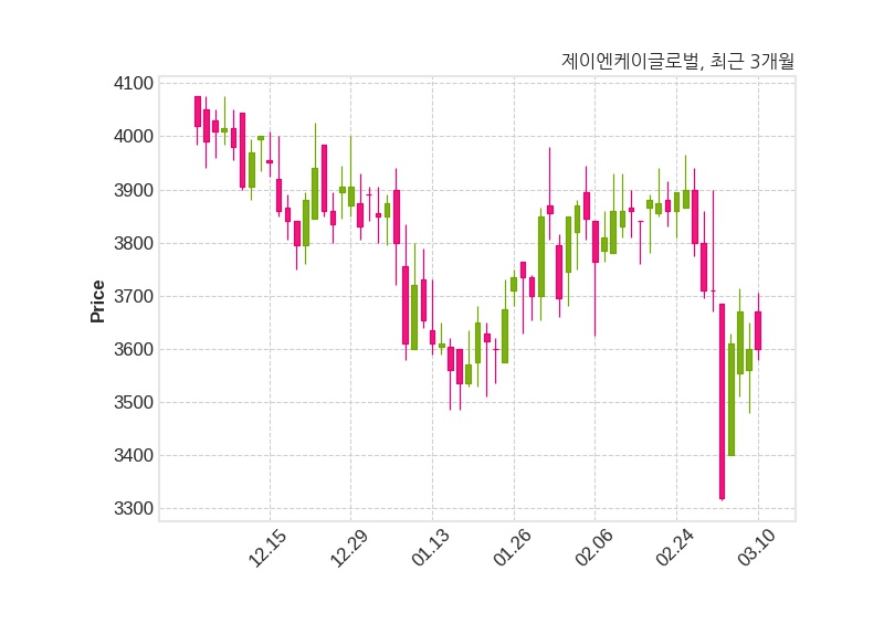 한편, 제이엔케이글로벌은 장 마감 이후 해당 기업공시를 발표했으며 오늘 종가가 3,600원, 거래량은 71,636주로, 직전 거래일 대비 변동이없다.