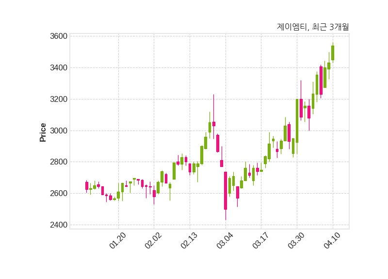한편, 제이엠티는 장 마감 이후 해당 기업공시를 발표했으며 오늘 종가가 3,540원, 거래량은 435,788주로, 직전 거래일 대비 110원(+3.21%) 상승했다.