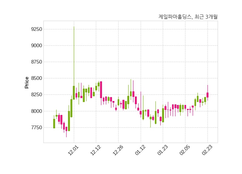 한편, 제일파마홀딩스는 장 마감 이후 해당 기업공시를 발표했으며 오늘 종가가 8,210원, 거래량은 13,331주로, 직전 거래일 대비 변동이없다.