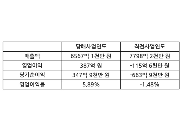 이번사업연도의 매출액은 직전사업연도 대비 -15.79% 감소한 6567억 1천만 원, 영업이익은 387억 원, 당기순이익은 347억 9천만 원이라고 공시했다.