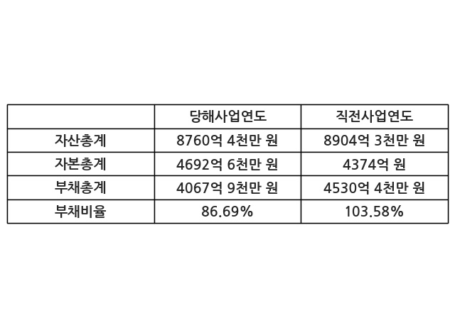 또한, 이번사업연도의 자산총계는 8760억 4천만 원으로 직전사업연도 대비 -1.62% 감소한 한편, 부채총계는 4067억 9천만 원으로 -10.21% 감소, 자본총계는 4692억 6천만 원으로 7.28% 증가했다.