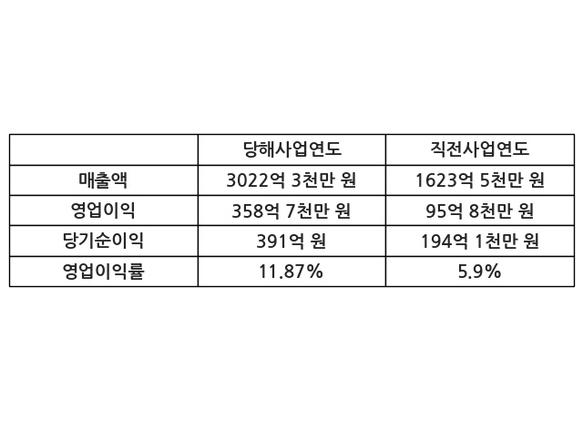 이번사업연도의 매출액은 직전사업연도 대비 86.16% 증가한 3022억 3천만 원, 영업이익은 358억 7천만 원, 당기순이익은 391억 원이라고 공시했다.