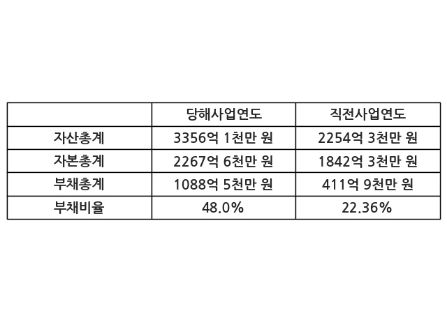 또한, 이번사업연도의 자산총계는 3356억 1천만 원으로 직전사업연도 대비 48.88% 증가한 한편, 부채총계는 1088억 5천만 원으로 164.24% 증가, 자본총계는 2267억 6천만 원으로 23.08% 증가했다.