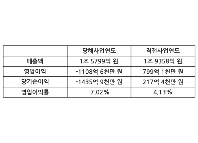 이번사업연도의 매출액은 직전사업연도 대비 -18.38% 감소한 1조 5799억 원, 영업이익은 -1108억 6천만 원, 당기순이익은 -1435억 9천만 원이라고 공시했다.
