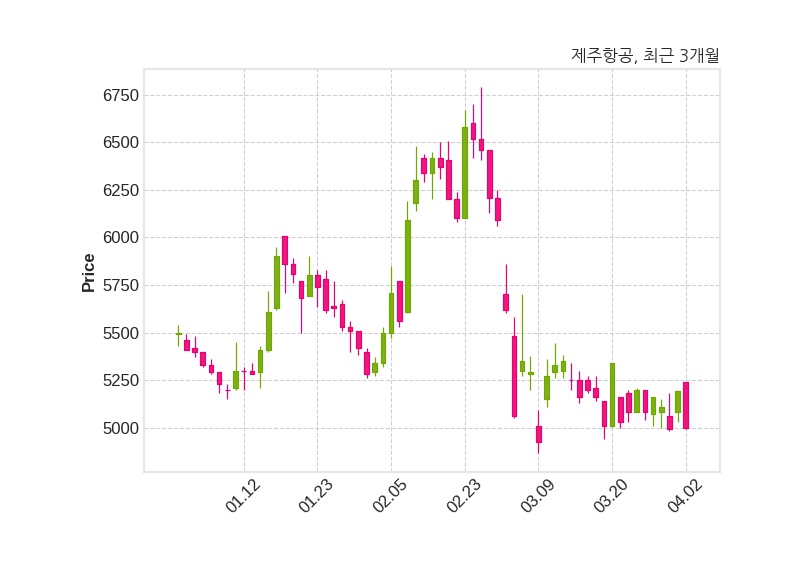 한편, 제주항공의 15시 10분 현재주가는 4,995원으로 직전 거래일 대비 195원(-3.76%) 하락이며, 거래량은 289,845주이다.