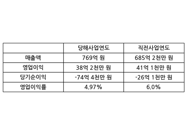 이번사업연도의 매출액은 직전사업연도 대비 12.23% 증가한 769억 원, 영업이익은 38억 2천만 원, 당기순이익은 -74억 4천만 원이라고 공시했다.