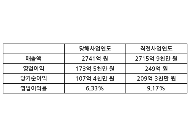 이번사업연도의 매출액은 직전사업연도 대비 0.92% 증가한 2741억 원, 영업이익은 173억 5천만 원, 당기순이익은 107억 4천만 원이라고 공시했다.