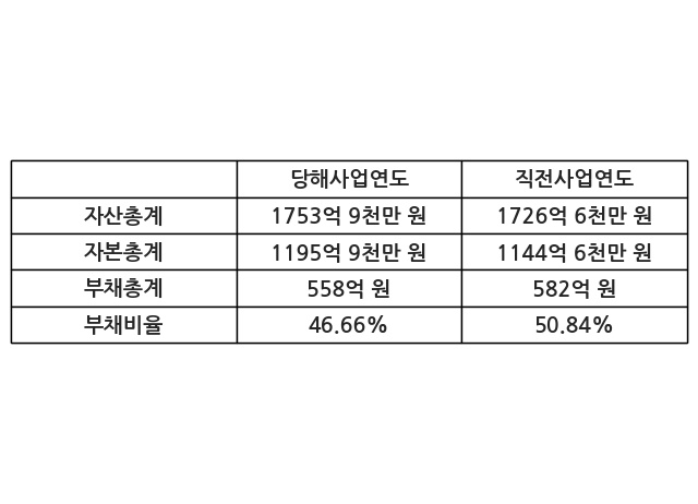 또한, 이번사업연도의 자산총계는 1753억 9천만 원으로 직전사업연도 대비 1.58% 증가한 한편, 부채총계는 558억 원으로 -4.12% 감소, 자본총계는 1195억 9천만 원으로 4.48% 증가했다.
