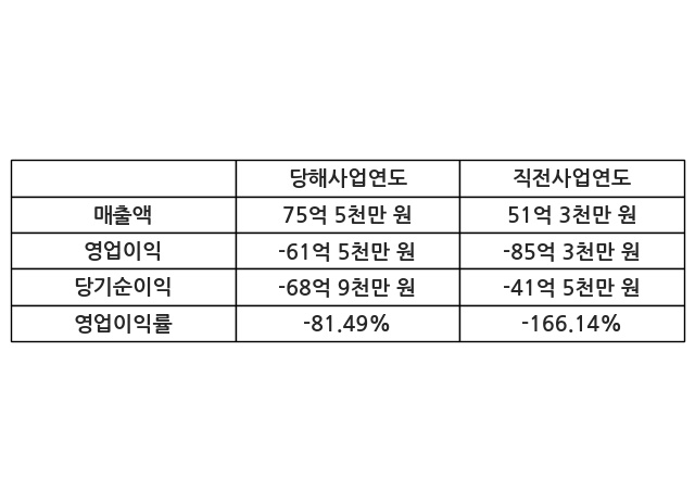 이번사업연도의 매출액은 직전사업연도 대비 47.03% 증가한 75억 5천만 원, 영업이익은 -61억 5천만 원, 당기순이익은 -68억 9천만 원이라고 공시했다.