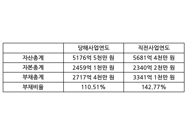 또한, 이번사업연도의 자산총계는 5176억 5천만 원으로 직전사업연도 대비 -8.89% 감소한 한편, 부채총계는 2717억 4천만 원으로 -18.67% 감소, 자본총계는 2459억 1천만 원으로 5.08% 증가했다.