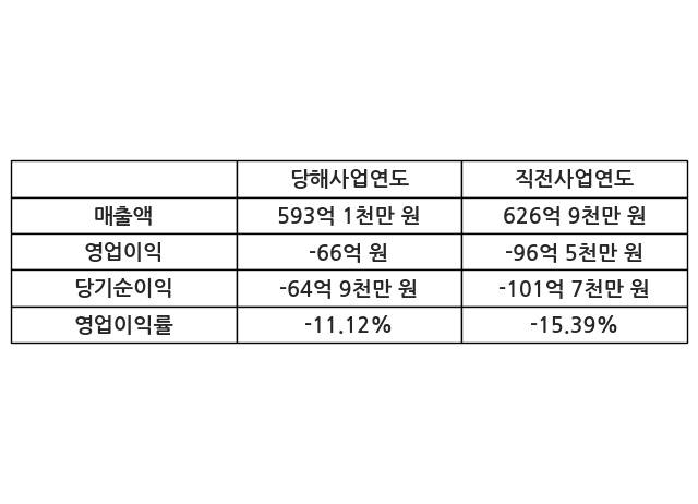 이번사업연도의 매출액은 직전사업연도 대비 -5.4% 감소한 593억 1천만 원, 영업이익은 -66억 원, 당기순이익은 -64억 9천만 원이라고 공시했다.