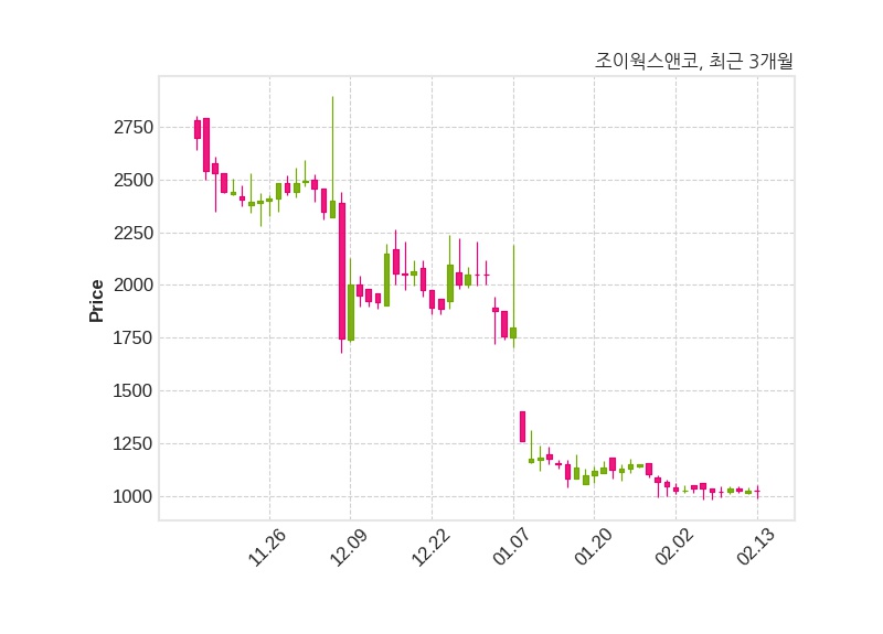 한편, 조이웍스앤코는 장 마감 이후 해당 기업공시를 발표했으며 오늘 종가가 1,023원, 거래량은 146,097주로, 직전 거래일 대비 3원(-0.29%) 하락했다.