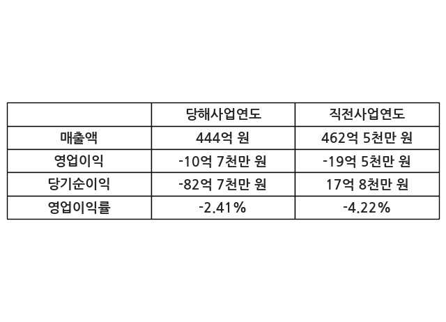 이번사업연도의 매출액은 직전사업연도 대비 -4.0% 감소한 444억 원, 영업이익은 -10억 7천만 원, 당기순이익은 -82억 7천만 원이라고 공시했다.
