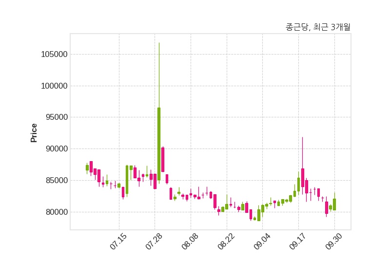 한편, 종근당은 장 마감 이후 해당 기업공시를 발표했으며 오늘 종가가 82,100원, 거래량은 54,437주로, 직전 거래일 대비 1,100원(+1.36%) 상승했다.