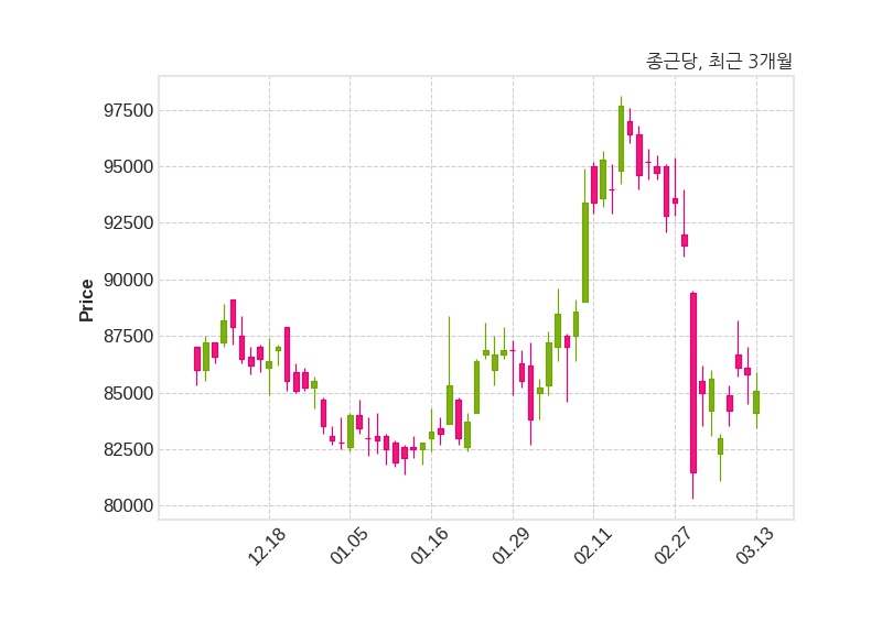 한편, 종근당은 장 마감 이후 해당 기업공시를 발표했으며 오늘 종가가 85,100원, 거래량은 22,338주로, 직전 거래일 대비 700원(-0.82%) 하락했다.
