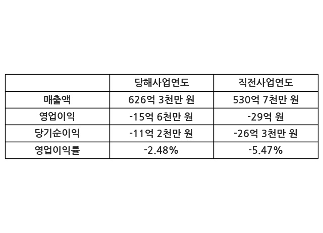 이번사업연도의 매출액은 직전사업연도 대비 18.01% 증가한 626억 3천만 원, 영업이익은 -15억 6천만 원, 당기순이익은 -11억 2천만 원이라고 공시했다.