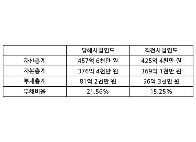 또한, 이번사업연도의 자산총계는 457억 6천만 원으로 직전사업연도 대비 7.57% 증가한 한편, 부채총계는 81억 2천만 원으로 44.24% 증가, 자본총계는 376억 4천만 원으로 1.98% 증가했다.