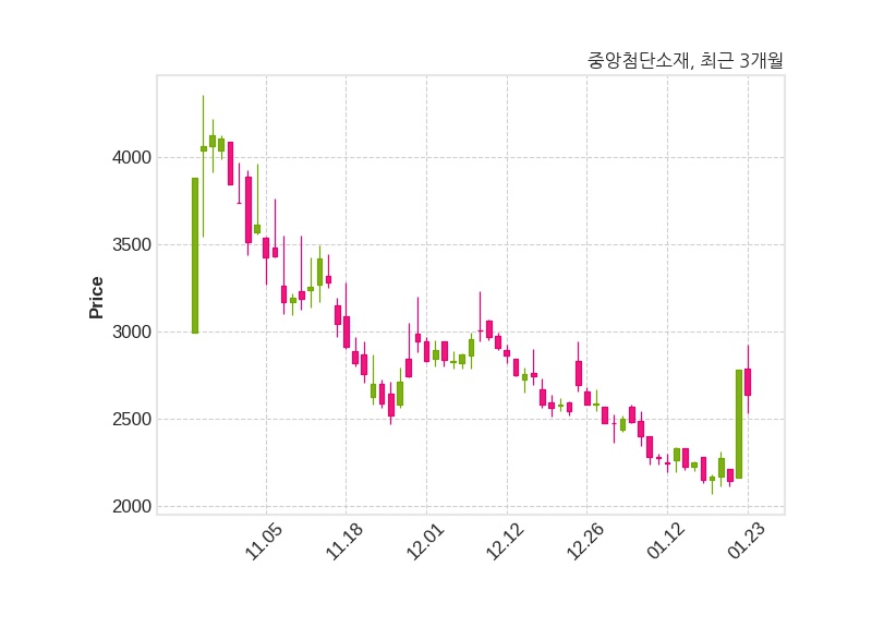 한편, 중앙첨단소재는 장 마감 이후 해당 기업공시를 발표했으며 오늘 종가가 2,635원, 거래량은 11,114,697주로, 직전 거래일 대비 145원(-5.22%) 하락했다.