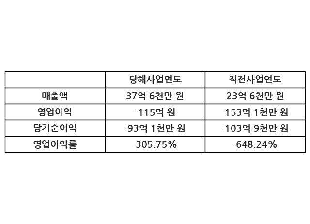 이번사업연도의 매출액은 직전사업연도 대비 59.17% 증가한 37억 6천만 원, 영업이익은 -115억 원, 당기순이익은 -93억 1천만 원이라고 공시했다.