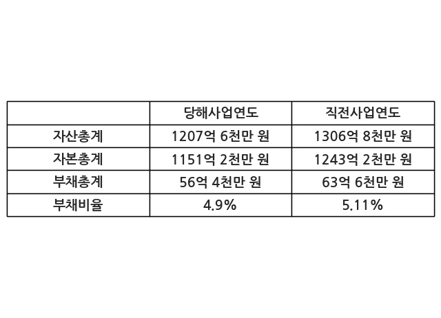 또한, 이번사업연도의 자산총계는 1207억 6천만 원으로 직전사업연도 대비 -7.59% 감소한 한편, 부채총계는 56억 4천만 원으로 -11.26% 감소, 자본총계는 1151억 2천만 원으로 -7.4% 감소했다.