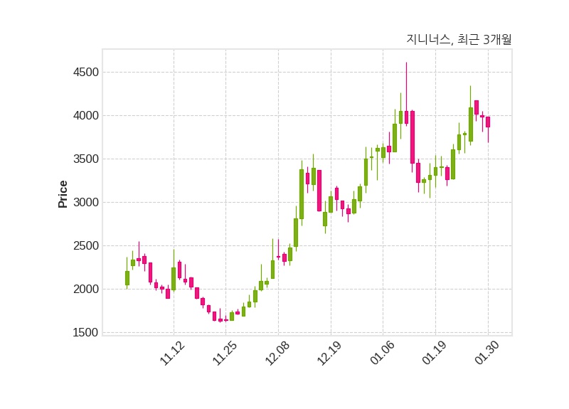 한편, 지니너스는 장 마감 이후 해당 기업공시를 발표했으며 오늘 종가가 3,870원, 거래량은 859,344주로, 직전 거래일 대비 110원(-2.76%) 하락했다.