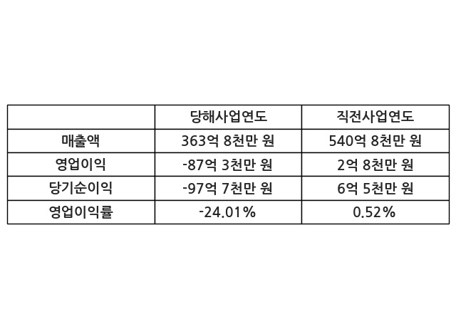 이번사업연도의 매출액은 직전사업연도 대비 -32.72% 감소한 363억 8천만 원, 영업이익은 -87억 3천만 원, 당기순이익은 -97억 7천만 원이라고 공시했다.