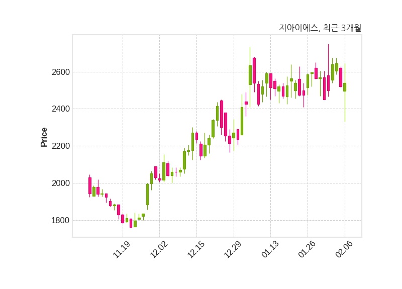 한편, 지아이에스는 장 마감 이후 해당 기업공시를 발표했으며 오늘 종가가 2,540원, 거래량은 547,991주로, 직전 거래일 대비 20원(+0.79%) 상승했다.