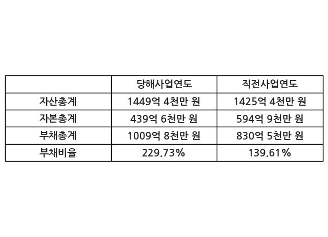 또한, 이번사업연도의 자산총계는 1449억 4천만 원으로 직전사업연도 대비 1.68% 증가한 한편, 부채총계는 1009억 8천만 원으로 21.59% 증가, 자본총계는 439억 6천만 원으로 -26.11% 감소했다.