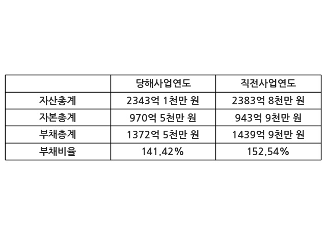 또한, 이번사업연도의 자산총계는 2343억 1천만 원으로 직전사업연도 대비 -1.71% 감소한 한편, 부채총계는 1372억 5천만 원으로 -4.68% 감소, 자본총계는 970억 5천만 원으로 2.82% 증가했다.