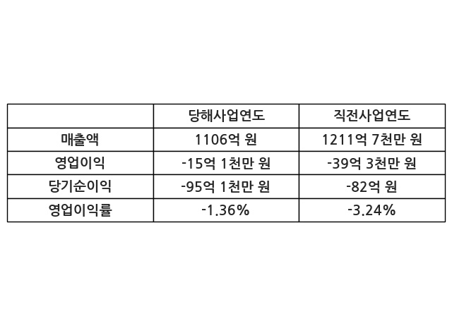 이번사업연도의 매출액은 직전사업연도 대비 -8.73% 감소한 1106억 원, 영업이익은 -15억 1천만 원, 당기순이익은 -95억 1천만 원이라고 공시했다.
