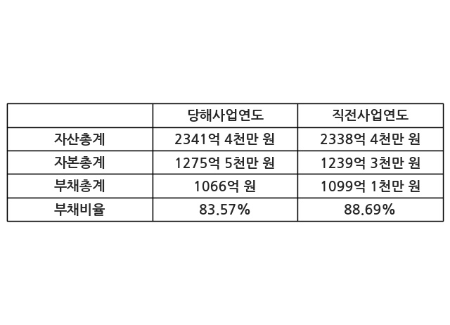 또한, 이번사업연도의 자산총계는 2341억 4천만 원으로 직전사업연도 대비 0.13% 증가한 한편, 부채총계는 1066억 원으로 -3.02% 감소, 자본총계는 1275억 5천만 원으로 2.92% 증가했다.