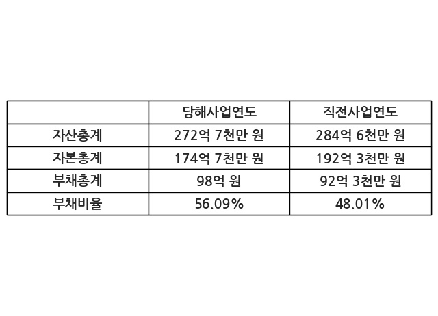 또한, 이번사업연도의 자산총계는 272억 7천만 원으로 직전사업연도 대비 -4.17% 감소한 한편, 부채총계는 98억 원으로 6.17% 증가, 자본총계는 174억 7천만 원으로 -9.13% 감소했다.