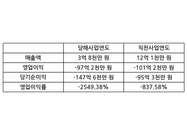 이번사업연도의 매출액은 직전사업연도 대비 -68.42% 감소한 3억 8천만 원, 영업이익은 -97억 2천만 원, 당기순이익은 -147억 6천만 원이라고 공시했다.