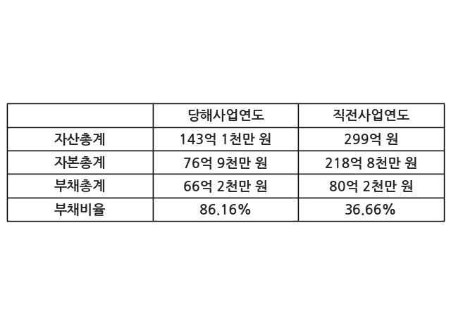 또한, 이번사업연도의 자산총계는 143억 1천만 원으로 직전사업연도 대비 -52.15% 감소한 한편, 부채총계는 66억 2천만 원으로 -17.44% 감소, 자본총계는 76억 9천만 원으로 -64.87% 감소했다.