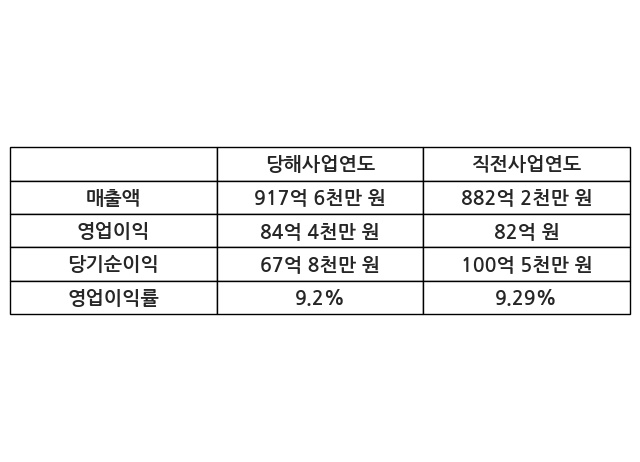 이번사업연도의 매출액은 직전사업연도 대비 4.01% 증가한 917억 6천만 원, 영업이익은 84억 4천만 원, 당기순이익은 67억 8천만 원이라고 공시했다.