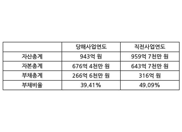또한, 이번사업연도의 자산총계는 943억 원으로 직전사업연도 대비 -1.74% 감소한 한편, 부채총계는 266억 6천만 원으로 -15.64% 감소, 자본총계는 676억 4천만 원으로 5.09% 증가했다.