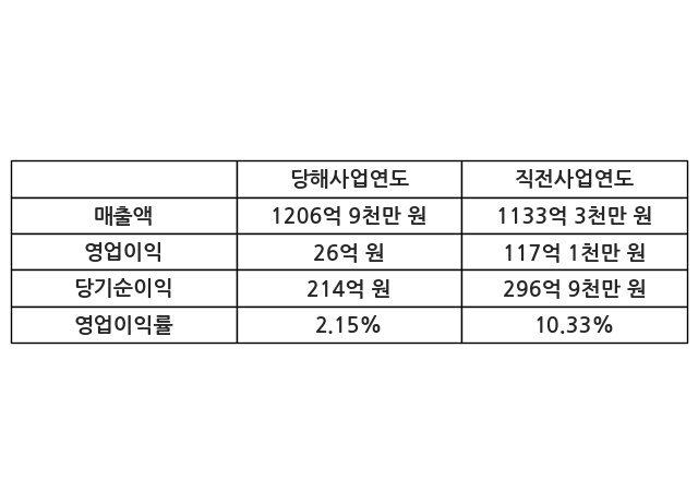 이번사업연도의 매출액은 직전사업연도 대비 6.49% 증가한 1206억 9천만 원, 영업이익은 26억 원, 당기순이익은 214억 원이라고 공시했다.