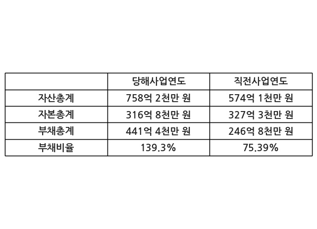또한, 이번사업연도의 자산총계는 758억 2천만 원으로 직전사업연도 대비 32.06% 증가한 한편, 부채총계는 441억 4천만 원으로 78.84% 증가, 자본총계는 316억 8천만 원으로 -3.21% 감소했다.