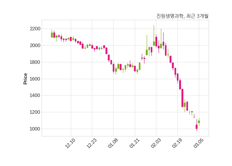 한편, 진원생명과학은 장 마감 이후 해당 기업공시를 발표했으며 오늘 종가가 1,096원, 거래량은 1,647,910주로, 직전 거래일 대비 90원(+8.95%) 상승했다.