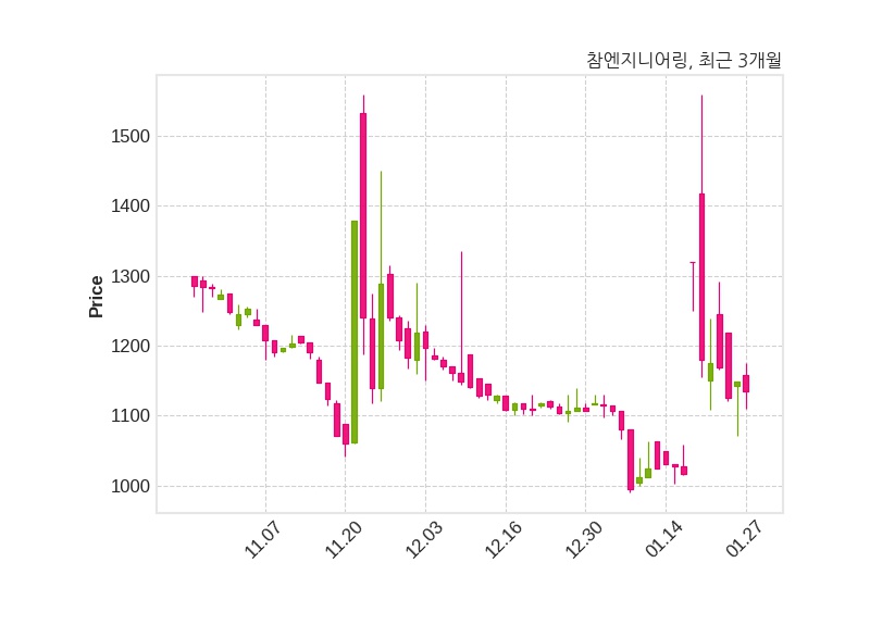 한편, 참엔지니어링은 장 마감 이후 해당 기업공시를 발표했으며 오늘 종가가 1,135원, 거래량은 115,962주로, 직전 거래일 대비 13원(-1.13%) 하락했다.