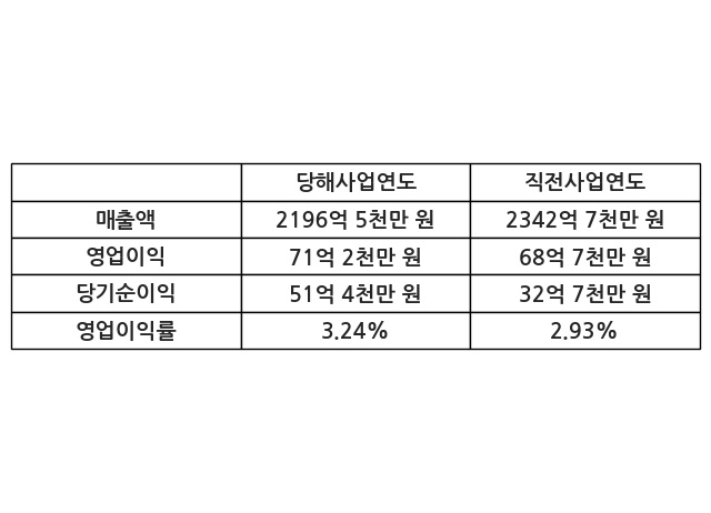 이번사업연도의 매출액은 직전사업연도 대비 -6.24% 감소한 2196억 5천만 원, 영업이익은 71억 2천만 원, 당기순이익은 51억 4천만 원이라고 공시했다.