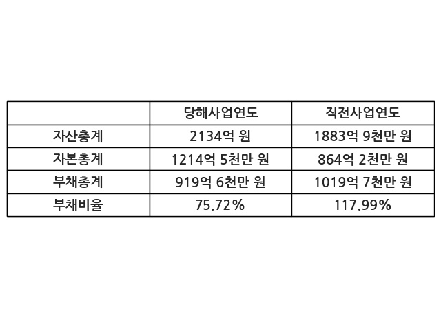 또한, 이번사업연도의 자산총계는 2134억 원으로 직전사업연도 대비 13.28% 증가한 한편, 부채총계는 919억 6천만 원으로 -9.82% 감소, 자본총계는 1214억 5천만 원으로 40.53% 증가했다.