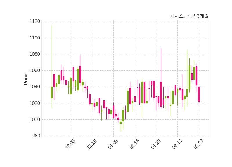 한편, 체시스는 장 마감 이후 해당 기업공시를 발표했으며 오늘 종가가 1,022원, 거래량은 321,961주로, 직전 거래일 대비 20원(-1.92%) 하락했다.