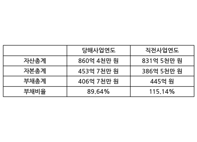 또한, 이번사업연도의 자산총계는 860억 4천만 원으로 직전사업연도 대비 3.49% 증가한 한편, 부채총계는 406억 7천만 원으로 -8.6% 감소, 자본총계는 453억 7천만 원으로 17.4% 증가했다.