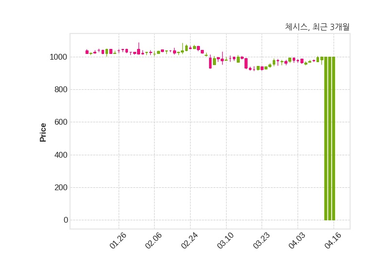 한편, 체시스는 장 마감 이후 해당 기업공시를 발표했으며 오늘 종가가 999원, 거래량은 0주로, 직전 거래일 대비 변동이없다.